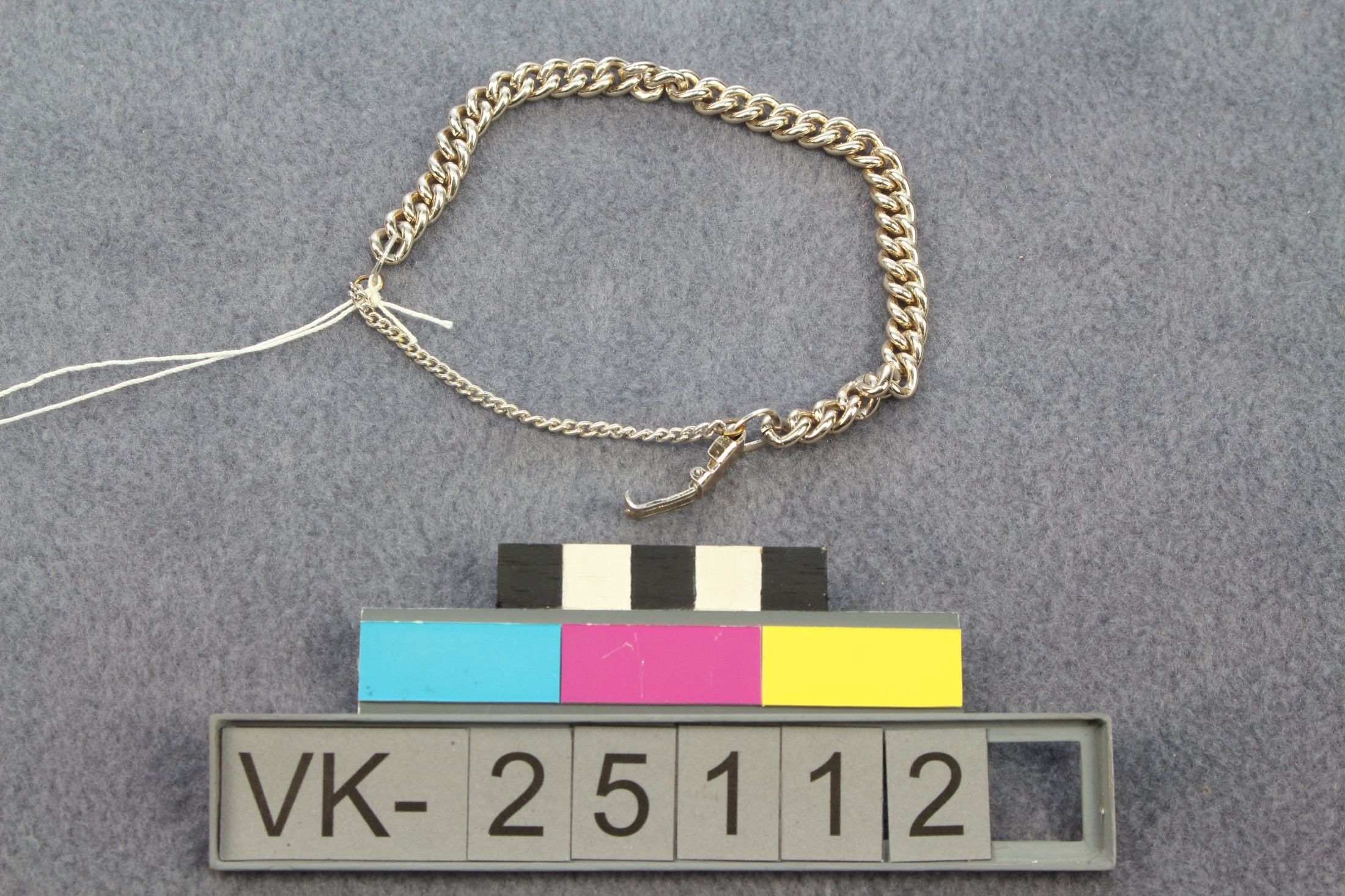 Versilbertes Armkettchen (Panzerkette) mit Sicherungskettchen und Faltverschluss. Das Objekt befindet sich in der Keksdose mit der Inventarnummer VK-25120.