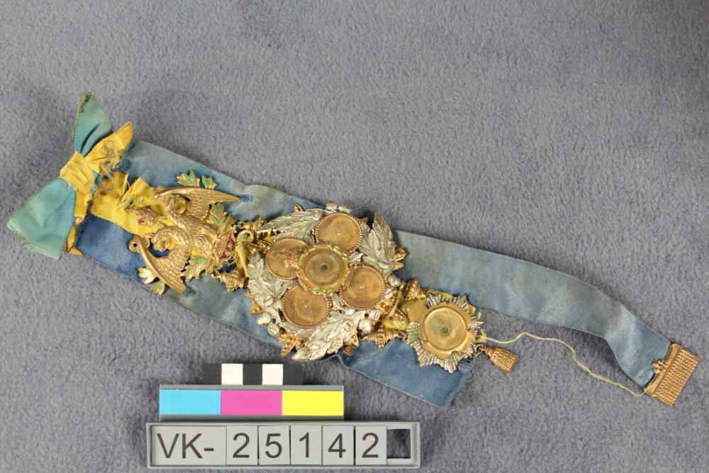Dreiteilige Kokarde, der obere Teil ist mit Krone und Doppeladler gestaltet, der mittlere Teil ist vierpassförmig und hat eine kleine Krone, unten ist noch ein kleineres rundes Element. Mittig und unten waren zusätzliche Abbildungen oder Beschriftungen angebracht. Die Kokarde ist auf Resten einer blau-gelben Seidenschleife befestigt.