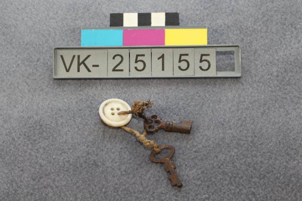 Zwei kleine Schlüssel von Schatullen oder Koffern mit einem beigen Knopf an einem Bändchen. Möglicherweise ein Erinnerungsstück. Das Objekt befindet sich in der Schatulle mit der Inventarnummer VK-25149.