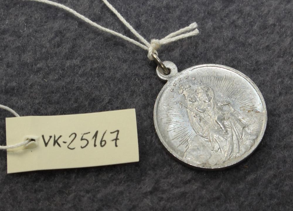 Runder Aluminiumanhänger von einem Rosenkreanz, eine Seite mit Maria mit Kind, andere Seite Herz Jesu. Das Objekt befindet sich in der Schatulle mit der Inventarnummer VK-25149.