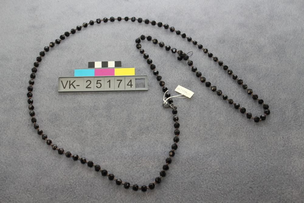 Lange Halskette aus schwarzen facettierten Halbedelsteinperlen mit einem silbernen Karabinerverschluss. Das Objekt befindet sich in der Schatulle mit der Inventarnummer VK-25149.