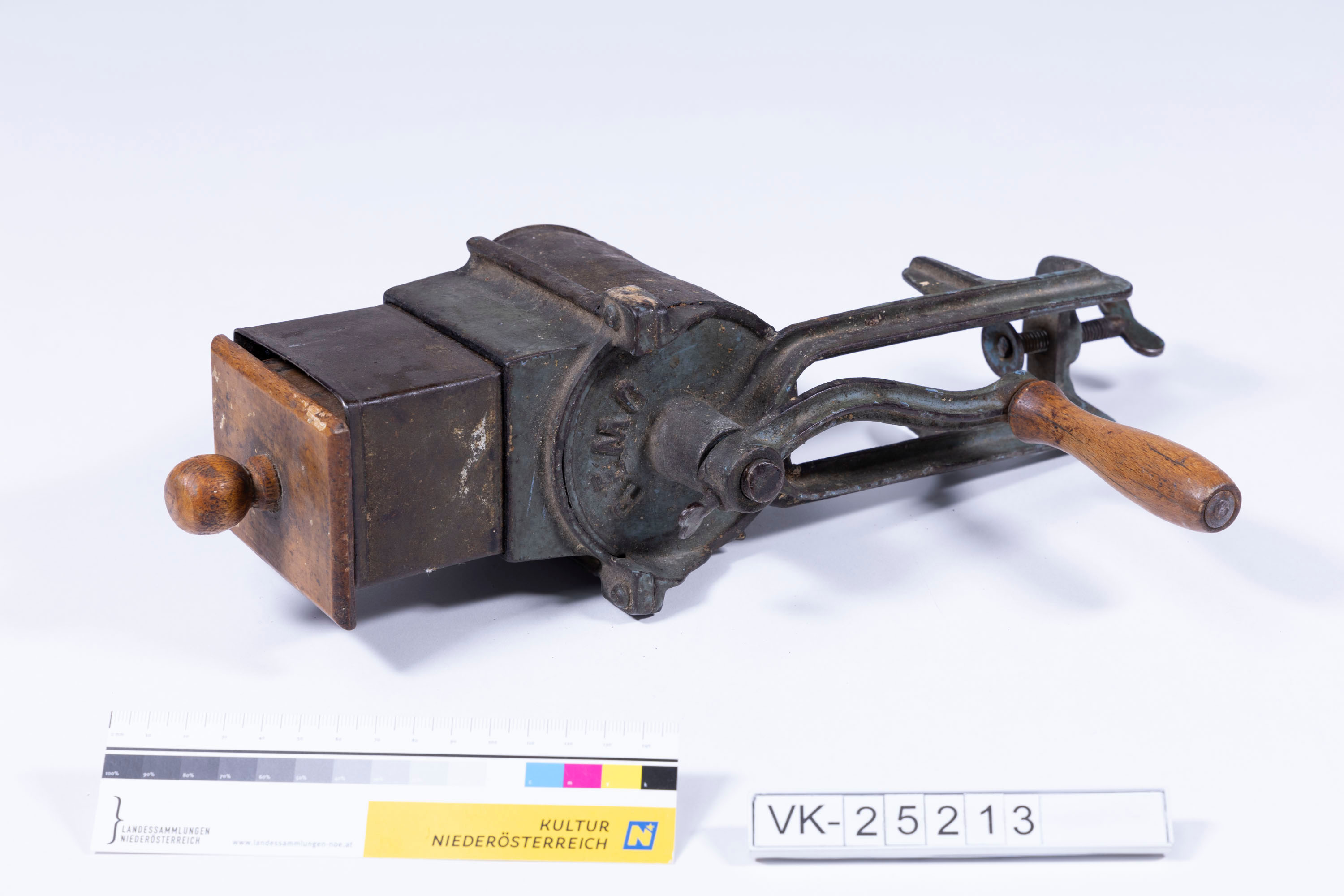 Reibe mit Tischplattenklemmung, hölzernem Kurbelgriff und aufgesetztem Zuführschacht mit hölzernem Nachführer. Die Maschine ist großteils grün lackiert und hat auf der Rückseite eine Herstellerbeschriftung: "REMO".