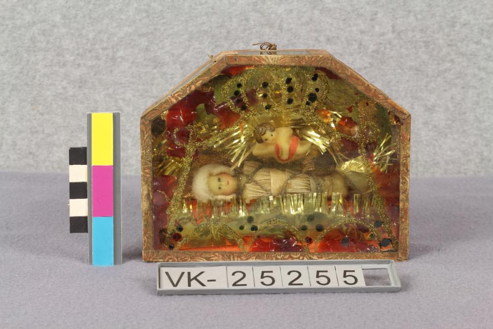 Wachsstock in einem Glaskästchen mit beidseitig abgekantetem Dachelement, darin ein Jesuskind, bekleidet mit Tüll und Golddrahtverzierungen, darüber ein Engel.
