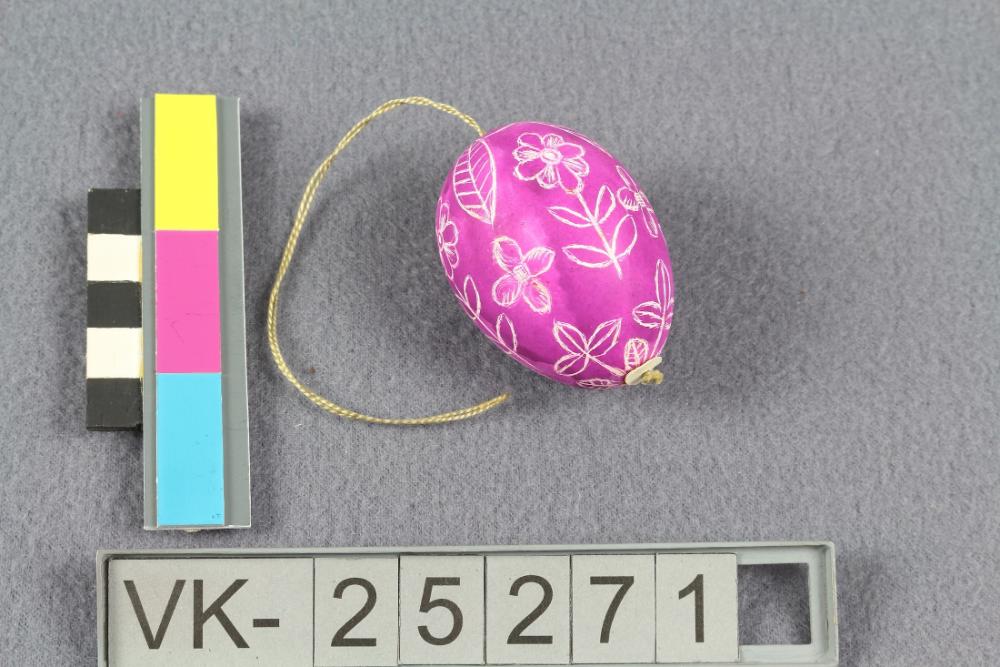 Violettes ausgeblasenes Ei an einem Bändchen, verziert mit Kratzverzierungen: Florale Motive.