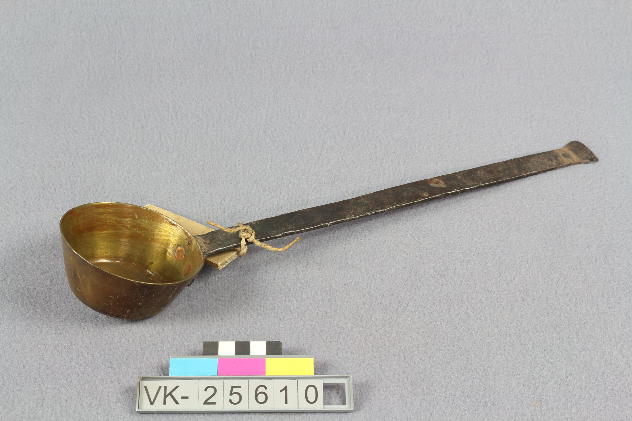 Kleines Pfännchen (ev. auch Schöpfer) aus Messing mit einem Eisenstiel.