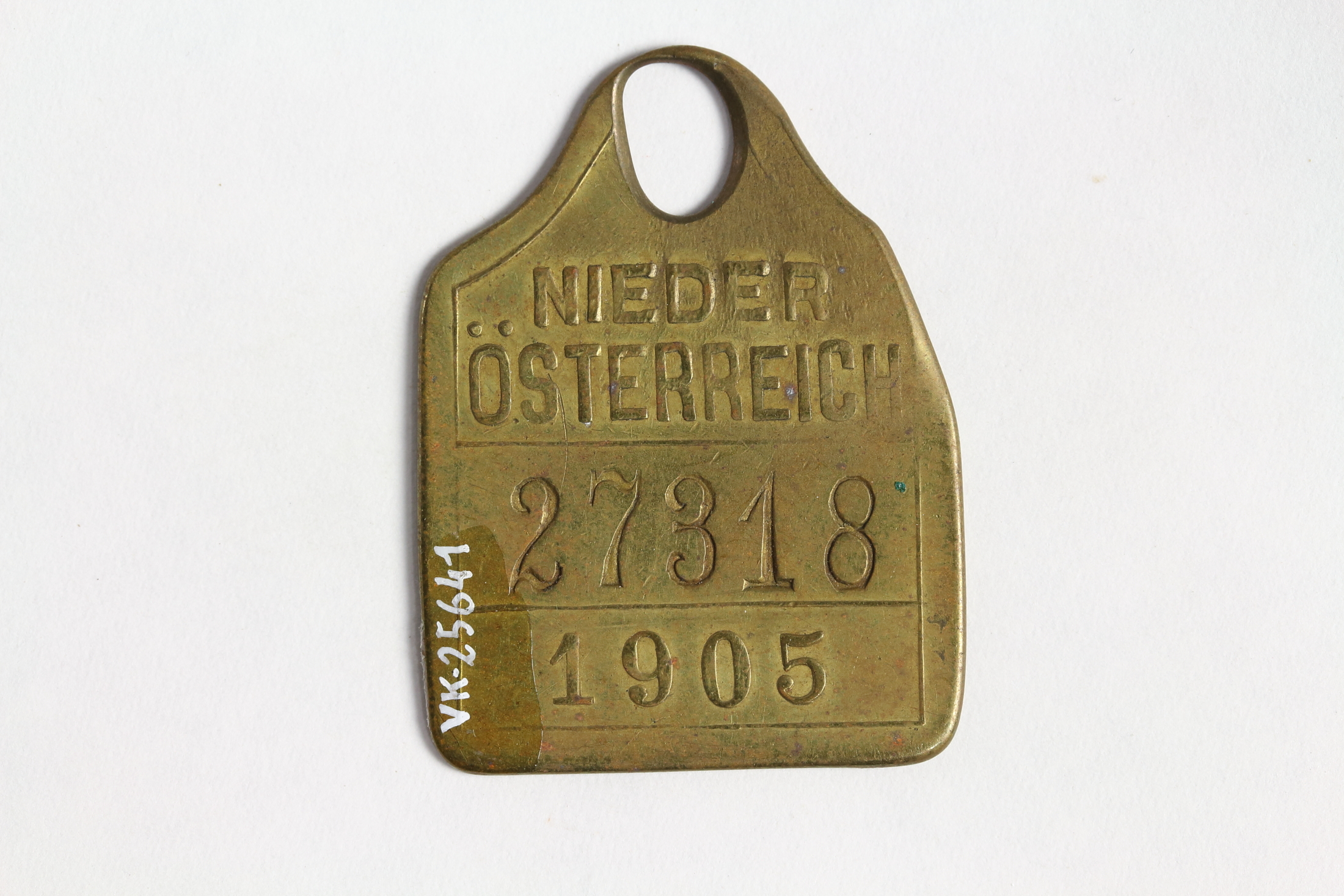 Hundemarke mit Abbildung eines Hundes und Beschriftung: "NIEDERÖSTERREICH 1905". Eingestanzte Nummer: 27318.