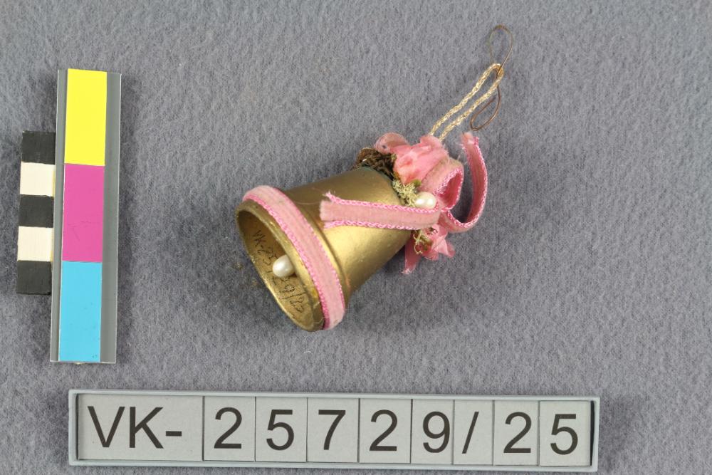 Goldfarbenes Tonglöckchen mit Kunstperlen und rosa Borten.