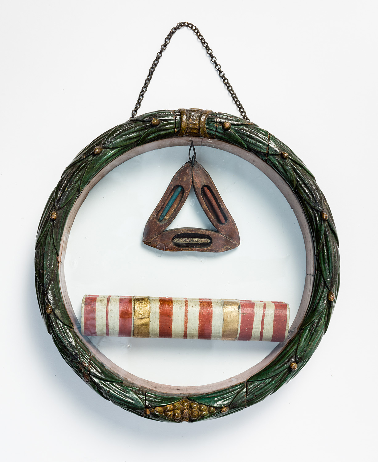 Zunftzeichen der Weber in einem Holzring mit Verglasung und Lorbeerkranz; darin die Nachbildung eines Stoffrollens und eines Trinakels aus drei Schiffchen mit farbigen Spulen.
