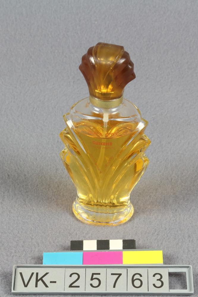 Parfumflacon mit Pumpspray und Deckel, das Glas ist in V-Formen gestuft. Beschriftung: "BLACK ONYX", "OBSCENE", etc. Das Parfum ist gleb eingefärbt und zu ca. 3/4 noch vorhanden.