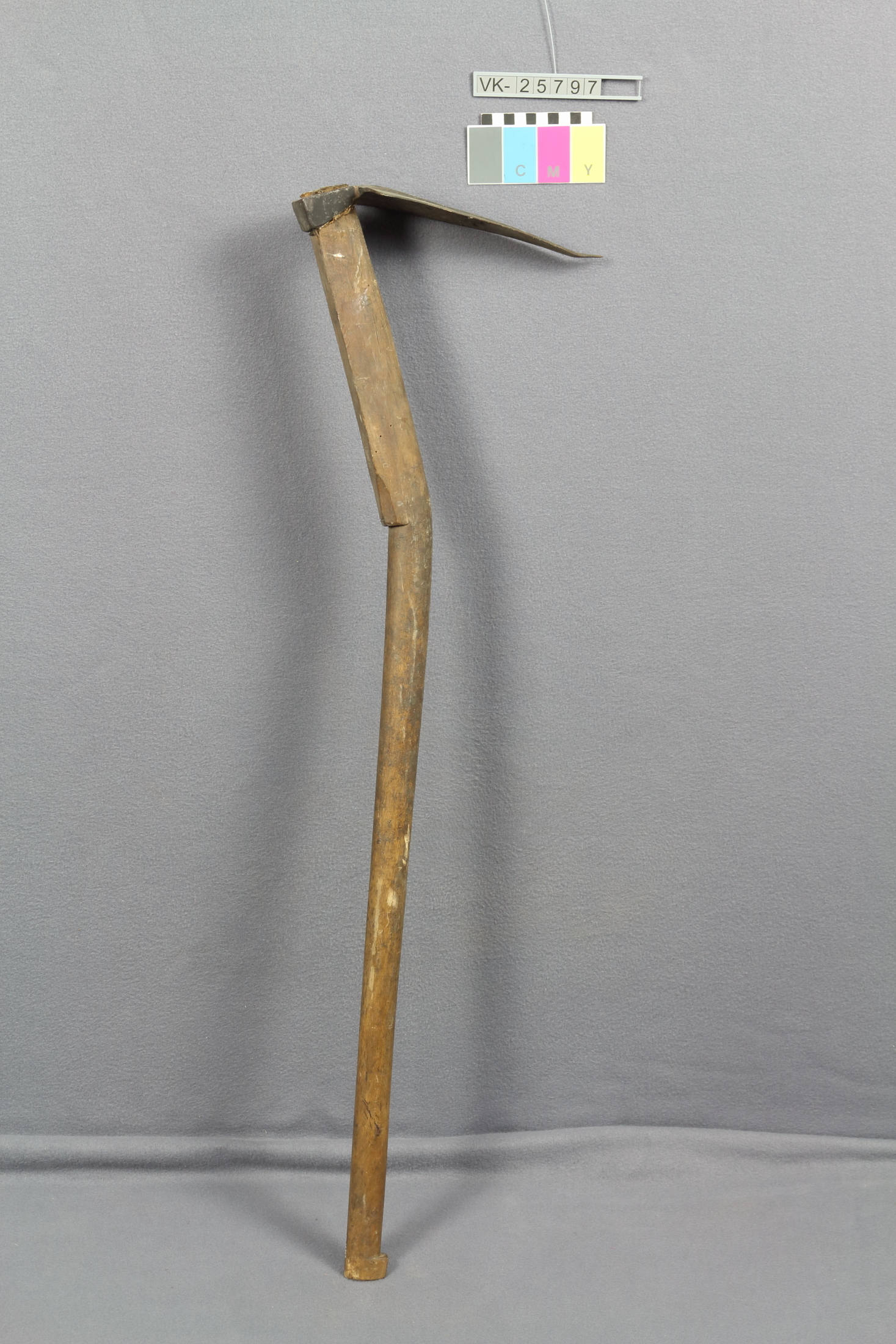 Dreieckiges Heindl mit abgewinkeltem Holzstiel.