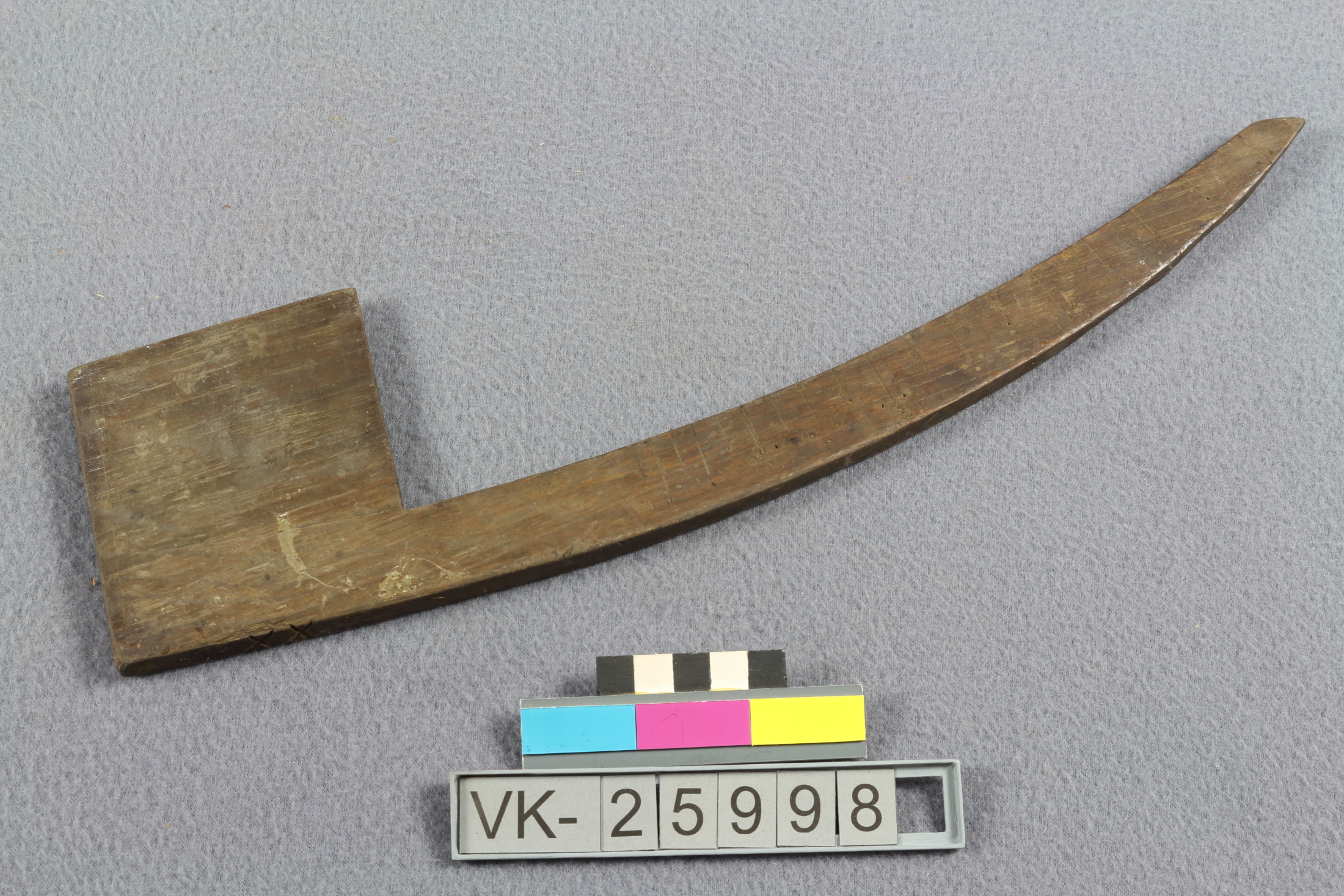 Binderwinkel: Holzbrettchen mit Krümmung, Griffbereich und einer eingeschnittenen Skala. Einschnitt an einer Seite: "XX".