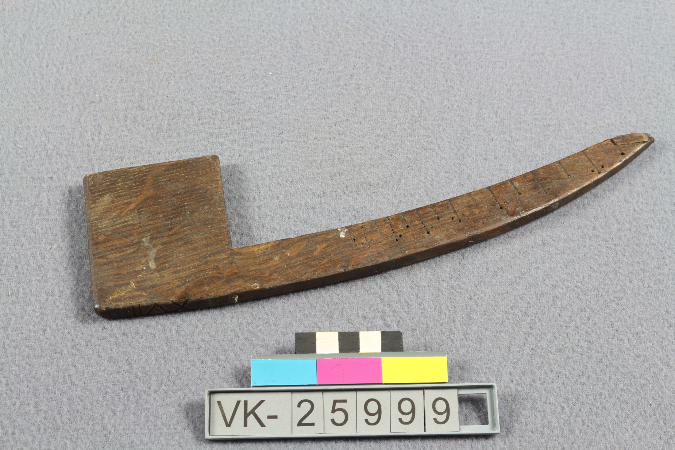 Binderwinkel: Holzbrettchen mit Krümmung, Griffbereich und einer eingeschnittenen Skala. Einschnitt an einer Seite: "XVII".