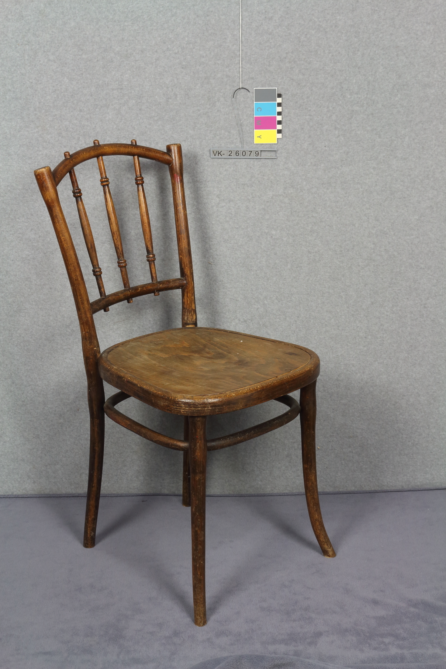 Bugholzsessel mit Sperrholzsitzschale und einer Lehne aus gedrechselten Stäben.