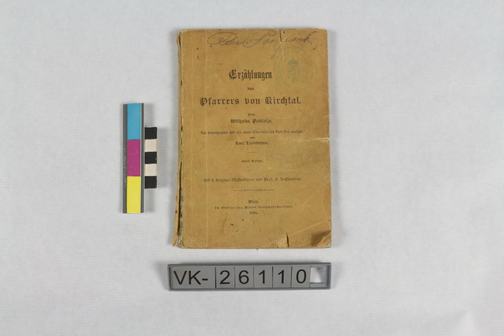 Buch "Erzählungen des Pfarrers von Kirchtal", 137 Seiten, hellbrauner Einband. Handschriftliche Vermerke: "Karli Rastenried" "Gu....straße 13".
