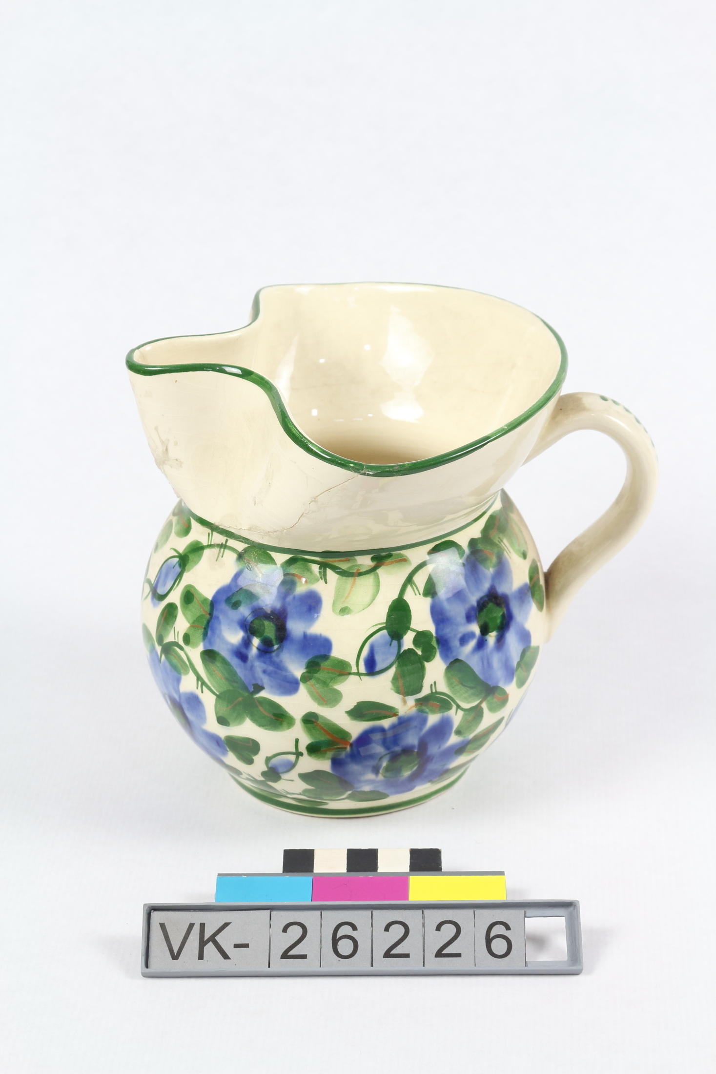 Bauchige Kanne mit schulterständigem Henkel, ausgestelltem Rand und Kleeblattmündung; der Bauch ist auf weißem Grund umlaufend floral mit blauen Blüten und Blattwerk bemalt.
