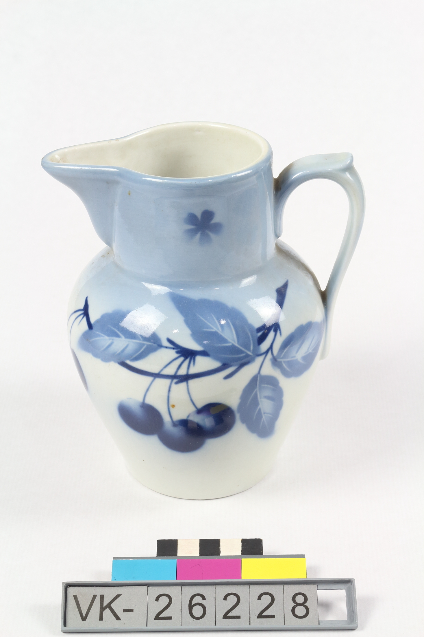 Bauchige Kanne mit Henkel und Schnabel, in Blautönen auf weiß mit einem Kirschendekor gestaltet. Bodenmarke: "Krautz berger".