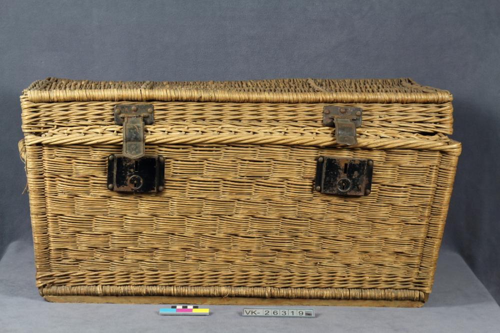 Geflochtene Kiste mit Klappdeckel und zwei Schlössern.