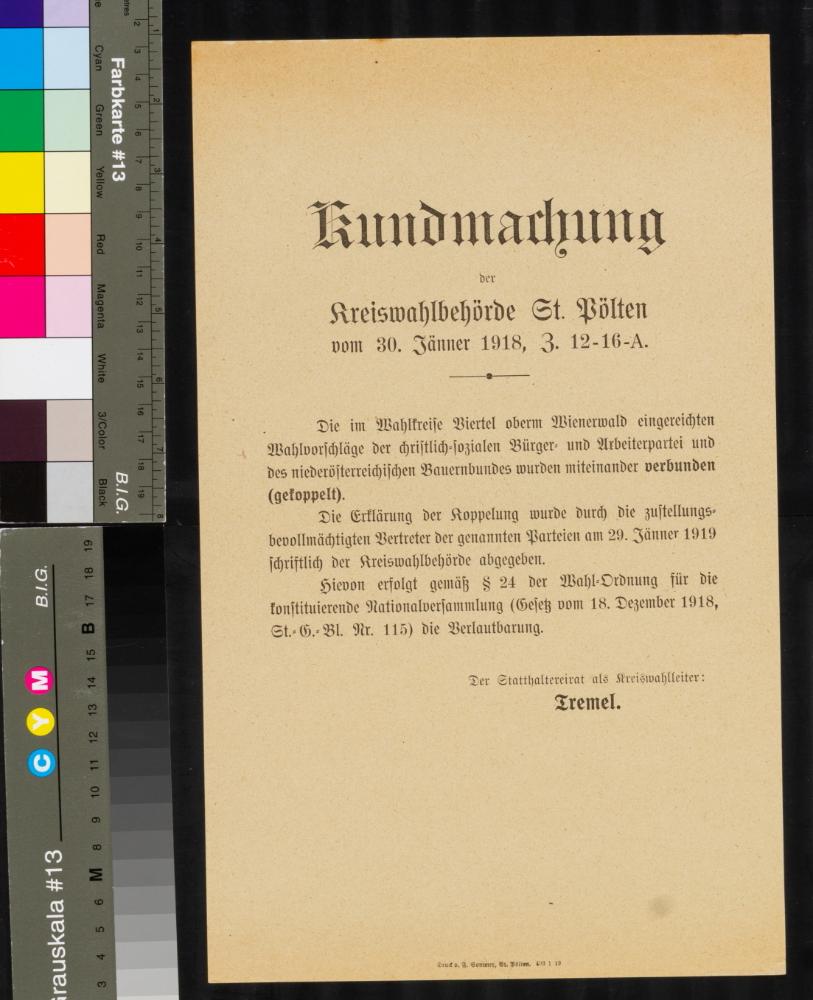Kundmachung, Wahlvorschläge der christlich=sozialen Bürger= und Arbeiterpartei und des niederösterreichischen Bauernbundes im wahlfreien Viertel oberm Wienerwald werden gekoppelt, Z. 12-16-A., Kreiswahlbehörde St. Pölten