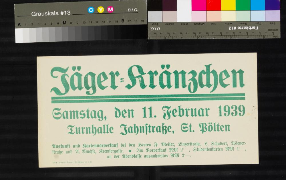 Veranstaltungsankündigung, Jäger=Kränzchen, 11. Februar 1939, Turnhalle, St. Pölten, Jahnstraße
