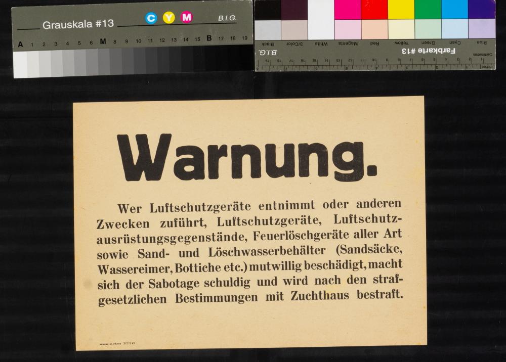 Hinweisblatt, Warnung, Luftschutzgeräte, Feuerlöschgeräte, Löschwasserbehälter etc. zu entwenden, St. Pölten 1943