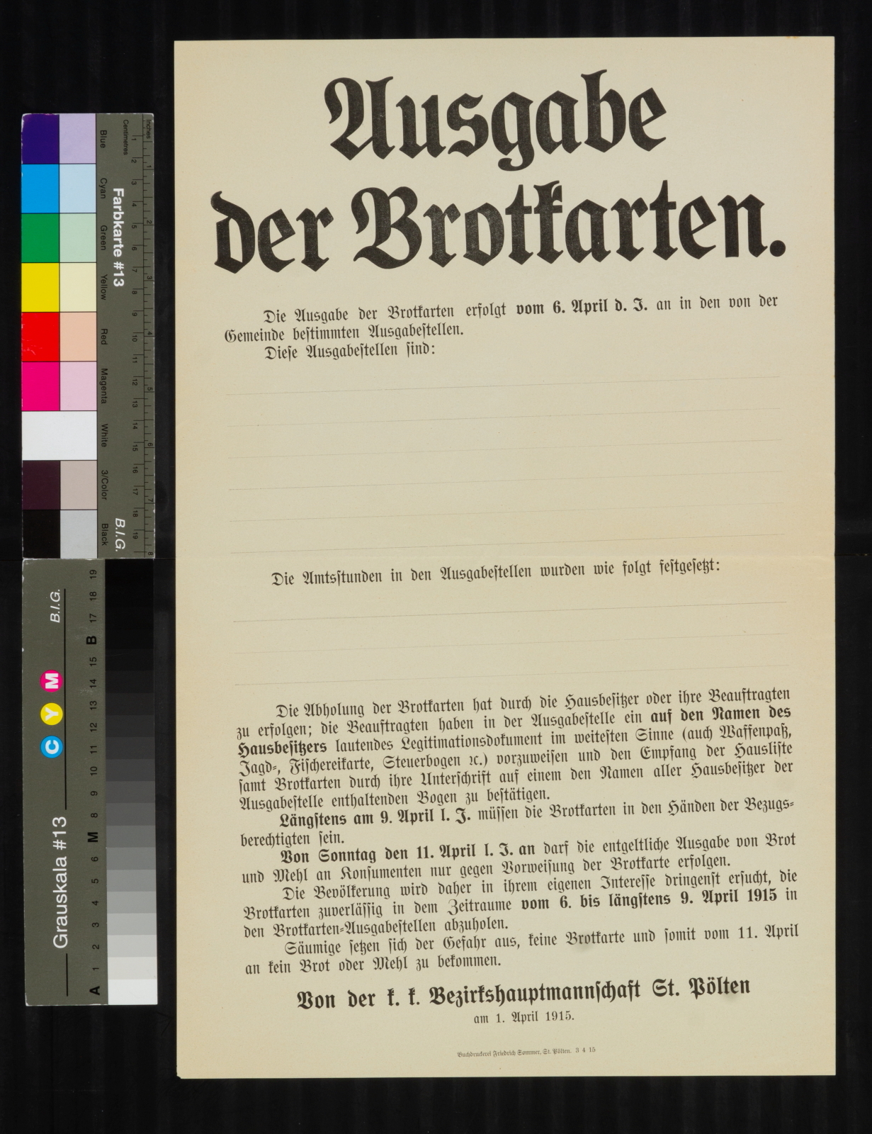 Kundmachung, Ausgabe der Brotkarten am 6. April - 9. April 1915, k. k. Bezirkshauptmannschaft St. Pölten