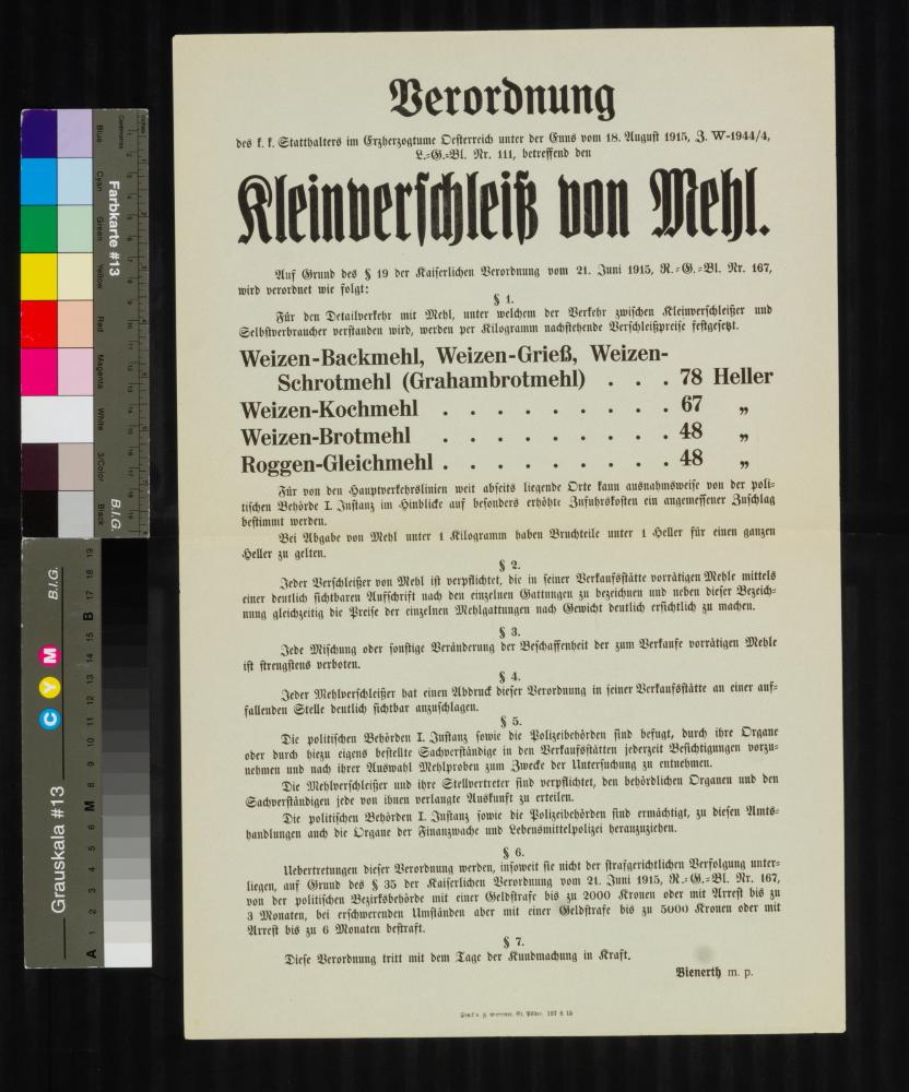 Verordnung, Betreffend den Kleinverschleiß von Mehl, 18. August 1915, Z. W - 1944/ 4, L.=G.=Bl. Nr. 11, k. k. Statthalter im Erzherzogtume Oesterreich unter der Enns