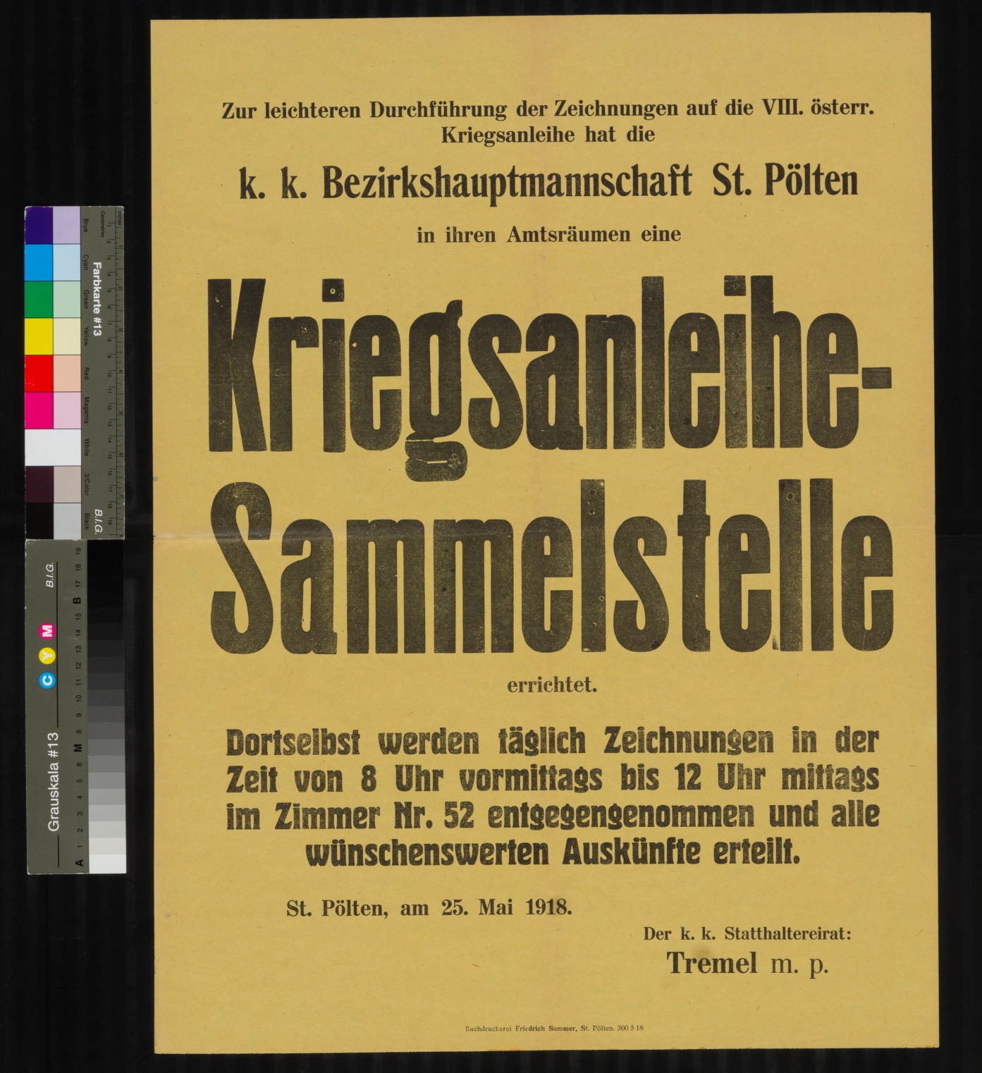 Kundmachung, Errichtung einer Kriegsanleihen-Sammelstelle in den Amtsräumen der k. k. Bezirkshauptmannschaft St. Pölten, 25. Mai 1918, k. k. Bezirkshauptmannschaft St. Pölten