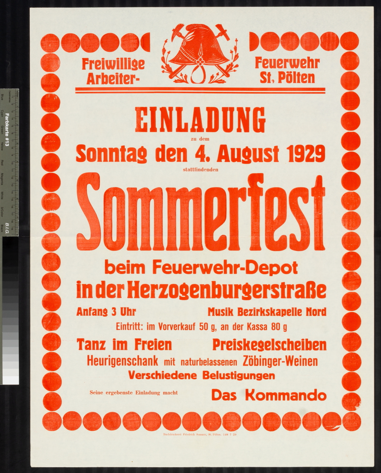 Veranstaltungsankündigung, Sommerfest der Freiwilligen Arbeiter-Feuerwehr St. Pölten, 4. August 1929, St. Pölten, beim Feuerwehr-Depot in der Herzogenburgerstraße