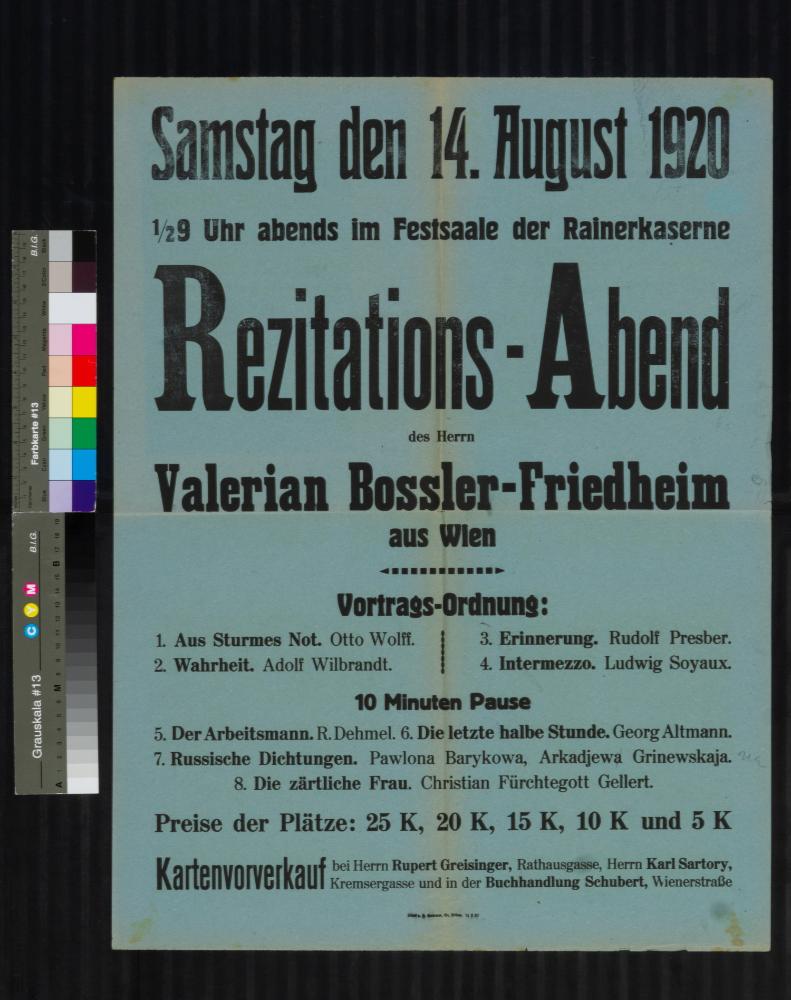 Veranstaltungsankündigung, Rezitationsabend Valerian Bossler - Friedheim, 14. August 1920, St. Pölten, Festsaal der Rainerkaserne. Dazu: Programmzettel, 5 Eintrittskarten