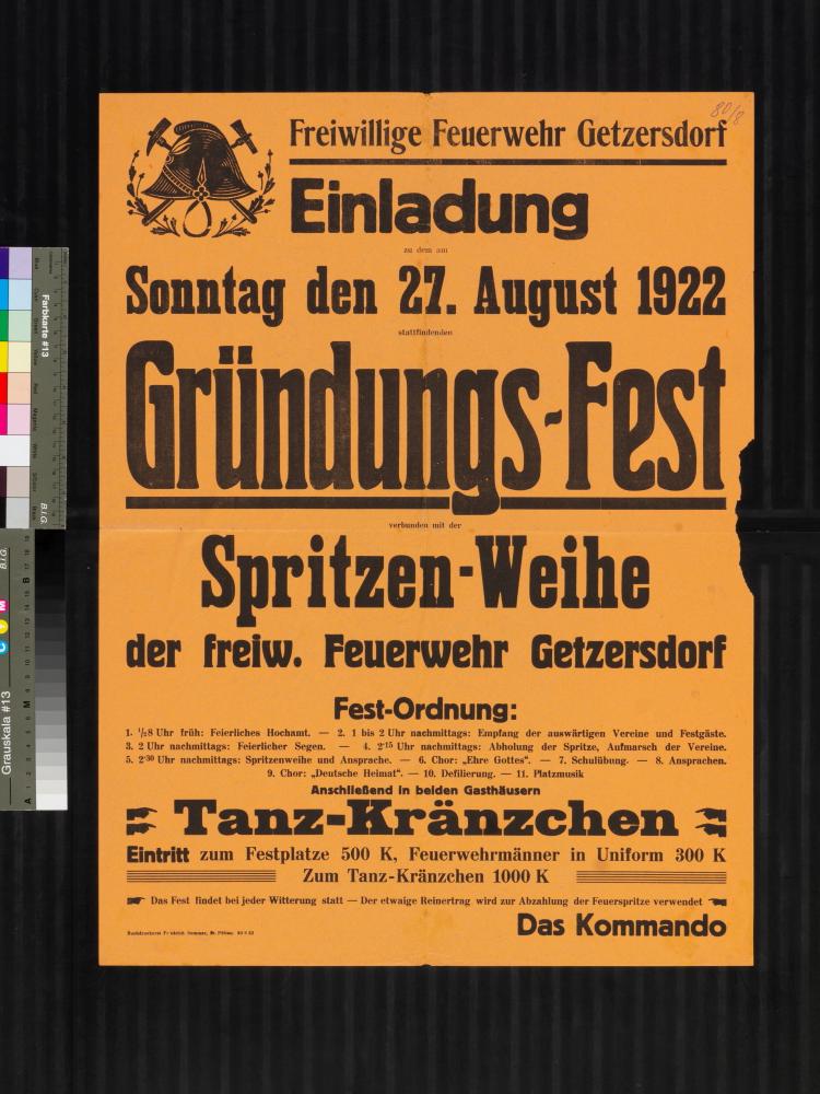 Einladung, 30-jähriges Gründungsfest verbunden mit Spritzenweihe der freiwilligen Feuerwehr Getzersdorf, 27. August 1922.