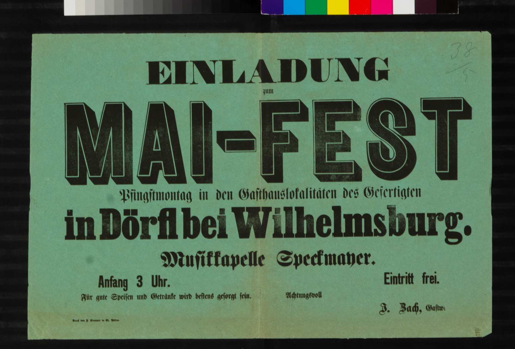 Einladung, Maifest beim Gastwirt J. Zach in Dörfl bei Wilhelmsburg.