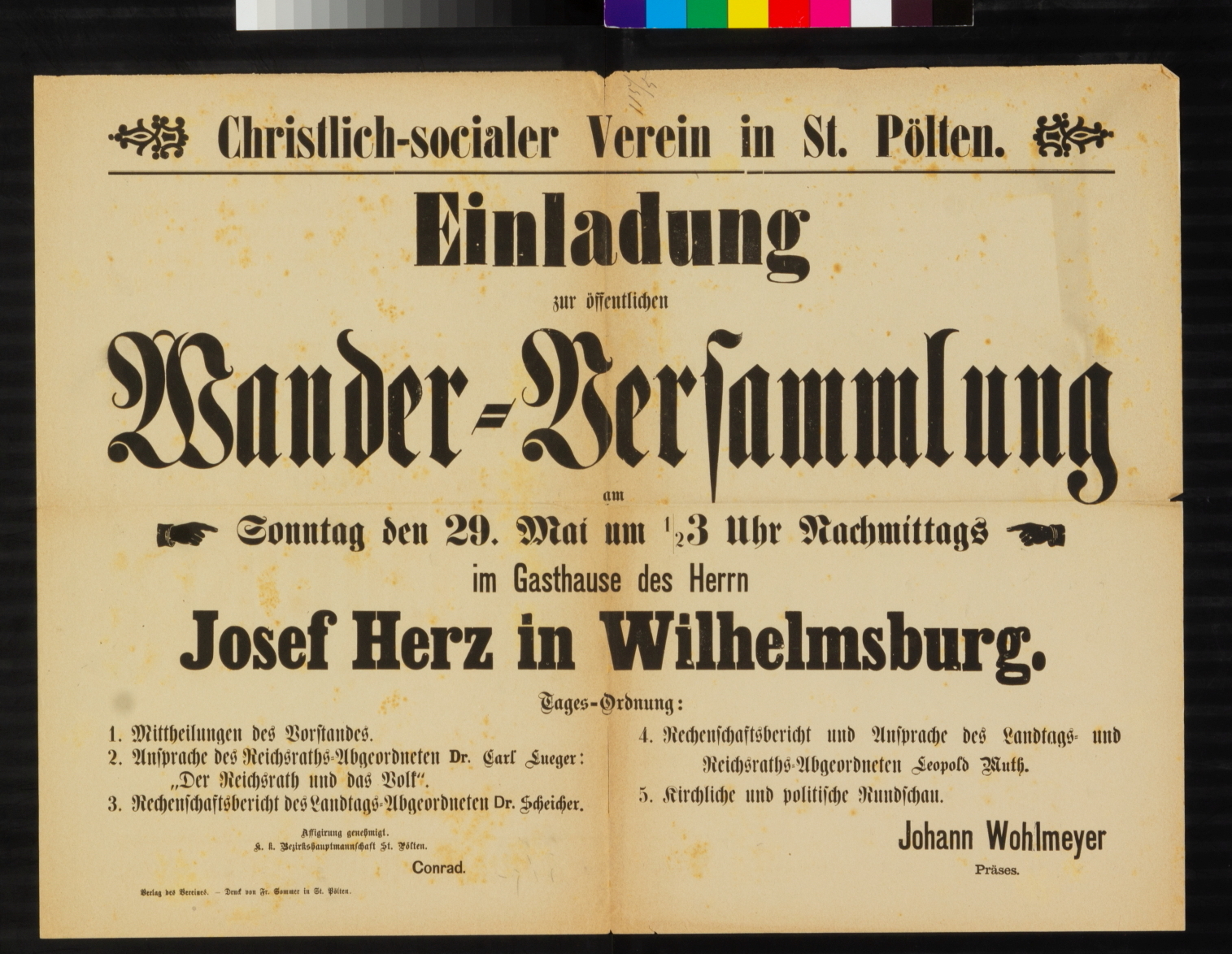 Einladung, Wanderversammlung des christlichsozialen Vereins St.Pölten, Gasthaus Josef Herz Wilhelmsburg, 29. Mai 1892.