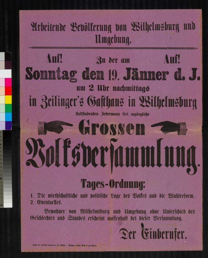 Volksversammlung, Arbeitende Bevölkerung von Wilhelmsburg und Umgebung, Gasthaus Zeilinger Michael, 19. Jänner 1896.