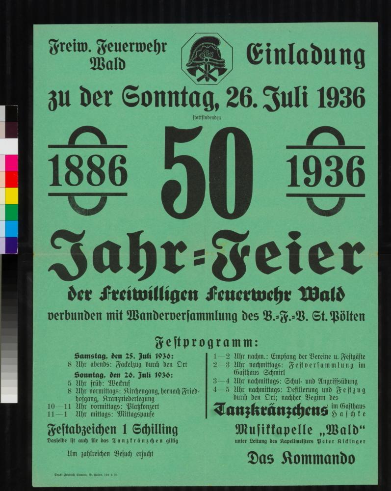 Einladung, 50 Jahrfeier freiwilligen Feuerwehr Wald mit Wanderversammlung, 26. Juli 1936.