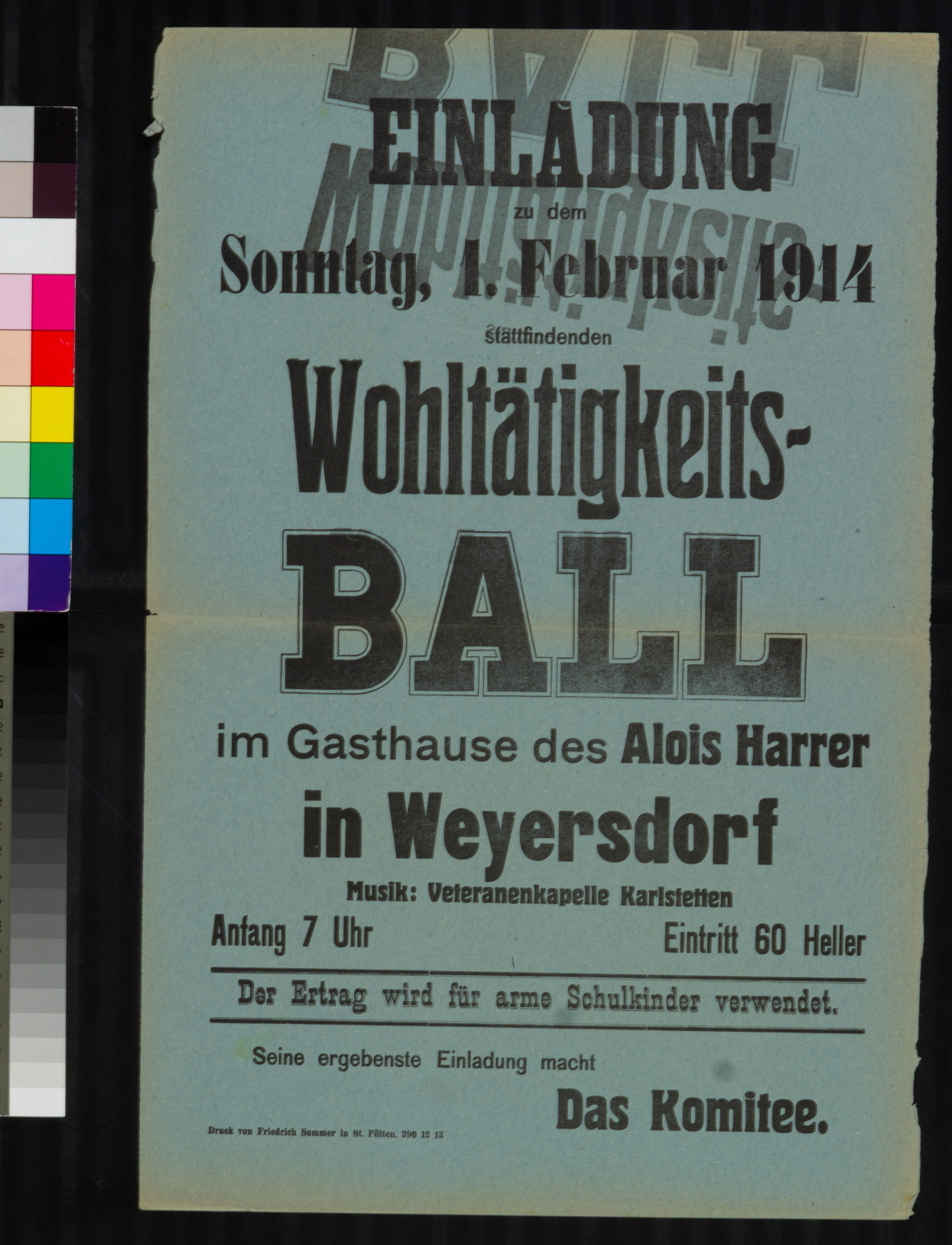 Einladung, Wohltätigkeitsball Weyersdorf, Gasthaus Alois Harrer, 1. Februar 1914.