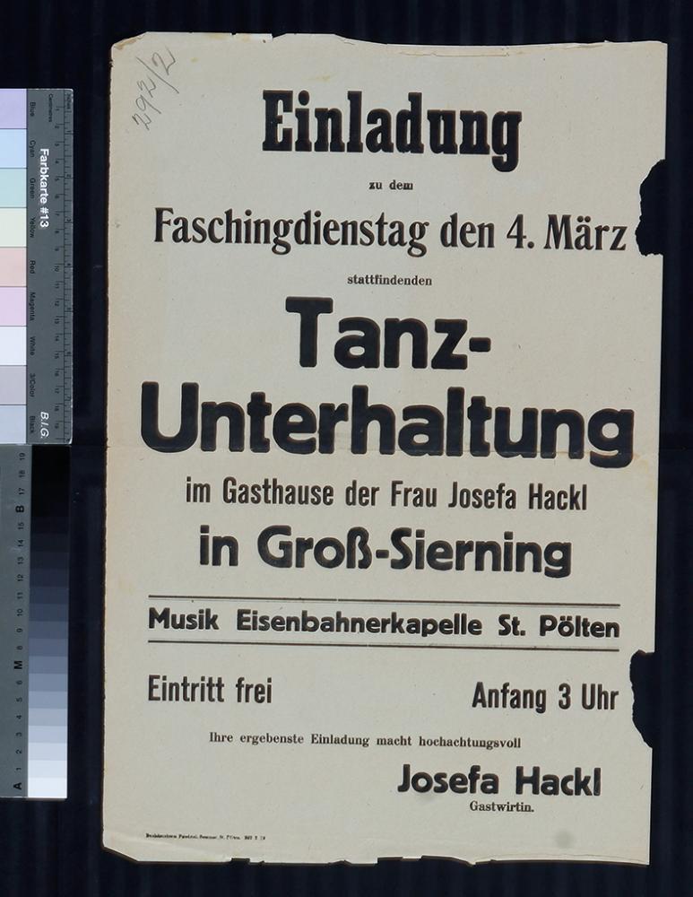 Einladung, Faschingsdienstag zur Tanzunterhaltung im Gasthaus Josefa Hackl in Groß Sierning, 4. März 1910.