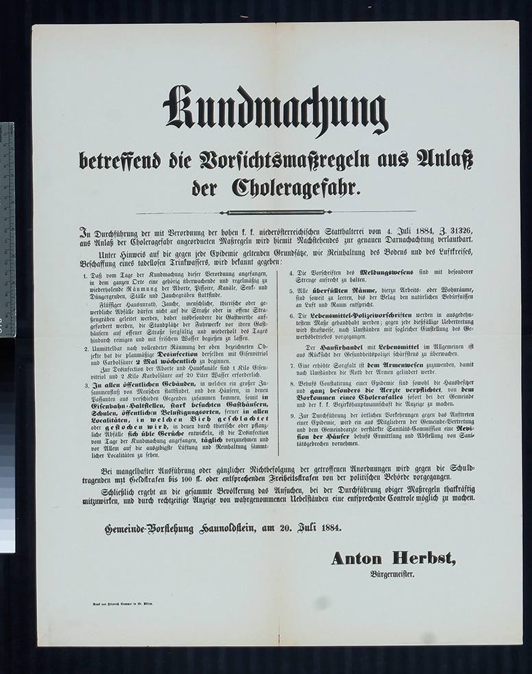 Kundmachung, Betreffend die Vorsichtsmaßregeln aus Anlass der Choleragefahr, Gemeinde Haunoldstein, 20. Juli 1884.