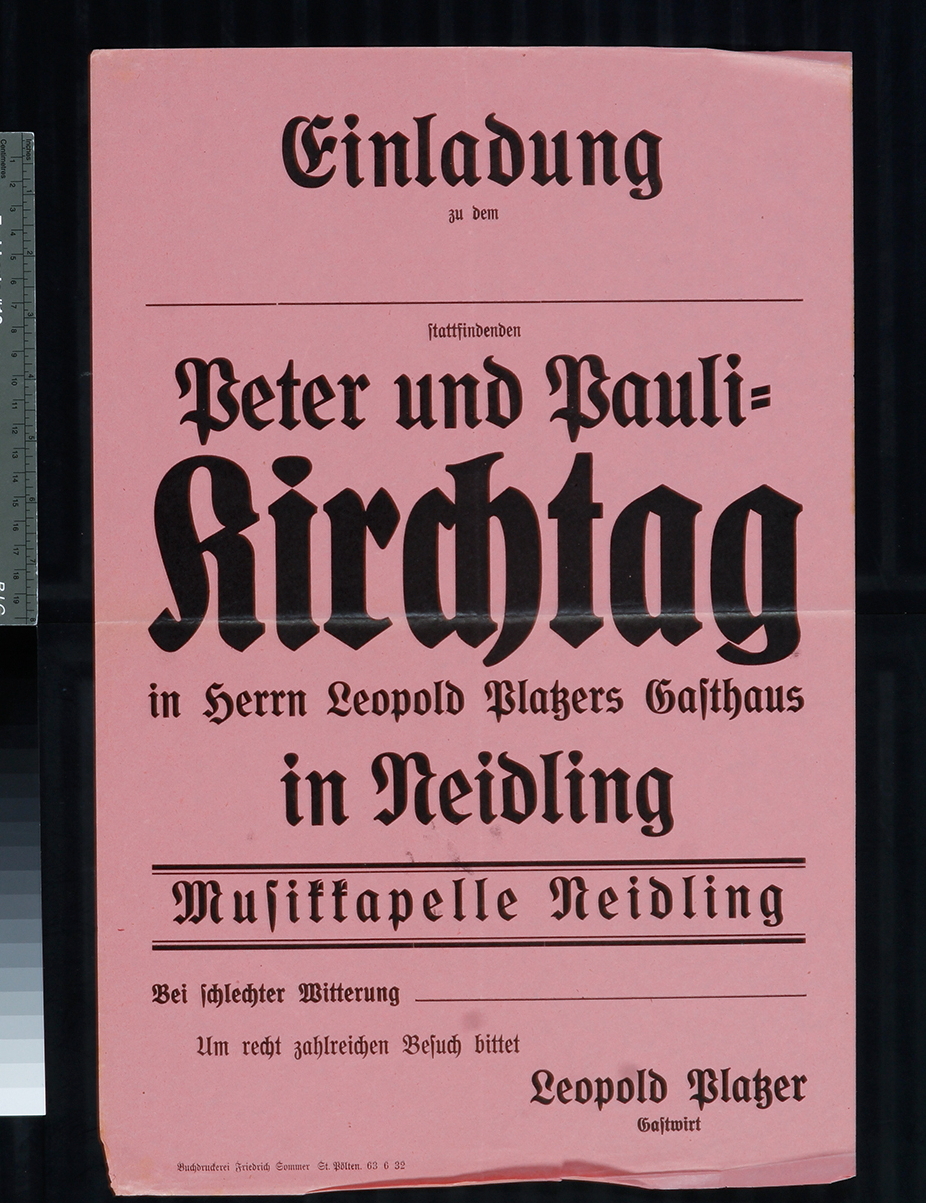 Einladung, Peter und Pauli-Kirchtag, Gasthaus Leopold Platzers in Neidling, 1932.