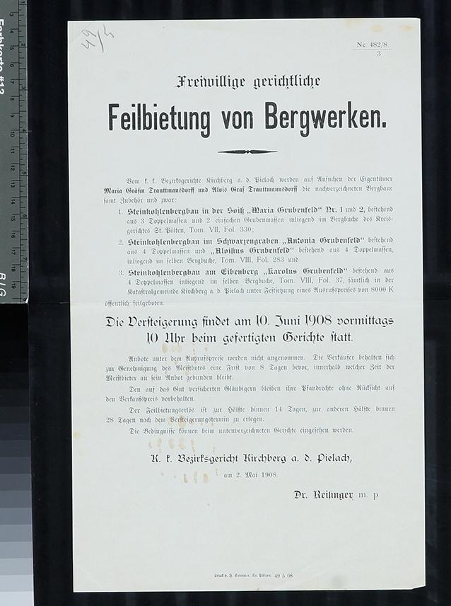 Ankündigung, Feilbietung von Bergwerken in Soitz, Schwarzengraben und Eibenberg im Bezirksgericht Kirchberg, Verkäufer Grafenfamilie Trauttmansdorff, 2. Mai 1908.