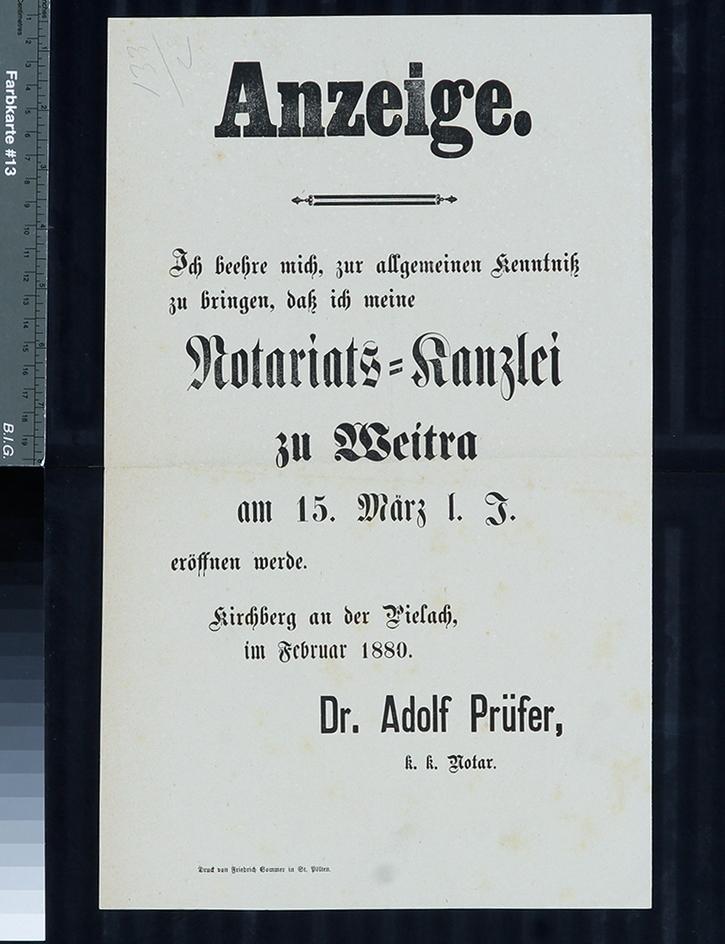 Anzeige, Eröffnung Notariatskanzlei Weitra, Notar Adolf Prüfer aus Kirchberg an der Pielach, Februar 1880.