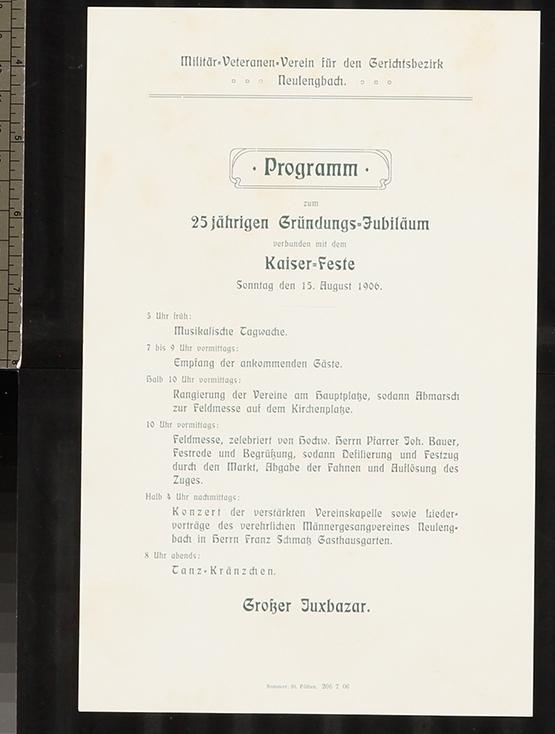 Einladung, 25-jähriges Gründungsjubiläum und Kaiserfest, Militärveteranenverein Gerichtsbezirk Neulengbach, 15. August 1906.
