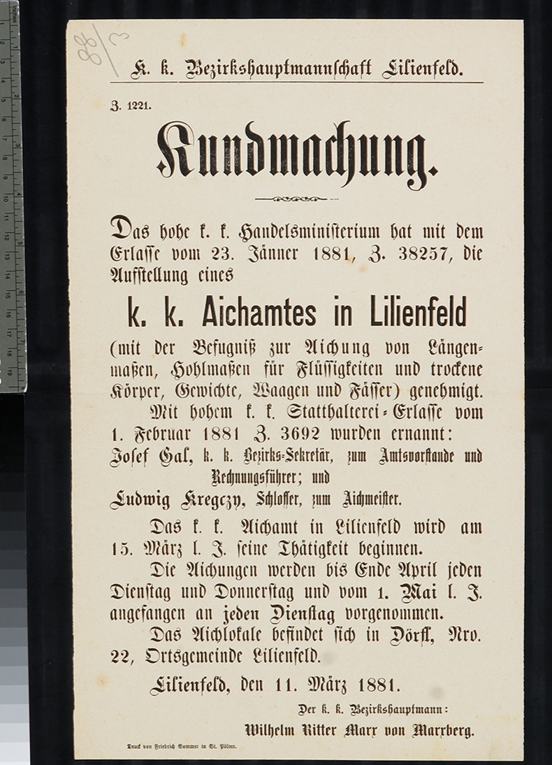 Kundmachung, Erlass Eröffnung k.k. Aichamtes in Lilienfeld, k.k. Bezirkshauptmann Wilhelm Ritter Marx von Marxberg, 11. März.1881.