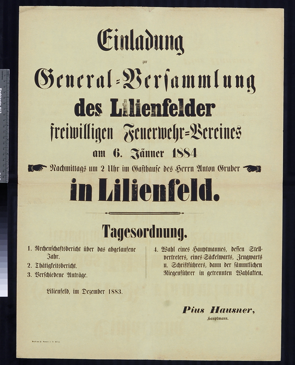 Einladung, Generalversammlung des freiwilligen Feuerwehrvereines in Lilienfeld, Hauptmann Pius Hausner, 6.1.1884.