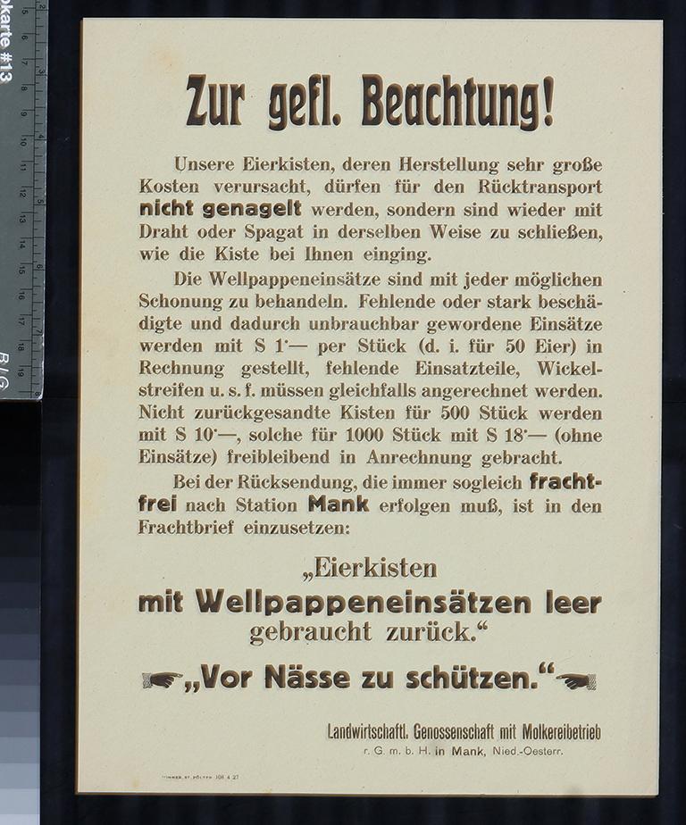 Zur gefl. Beachtung, Eierkisten dürfen bei Rücktransport nicht genagelt werden, Landwirtschaftl. Genossenschaft mit Molkereibetrieb Mank.