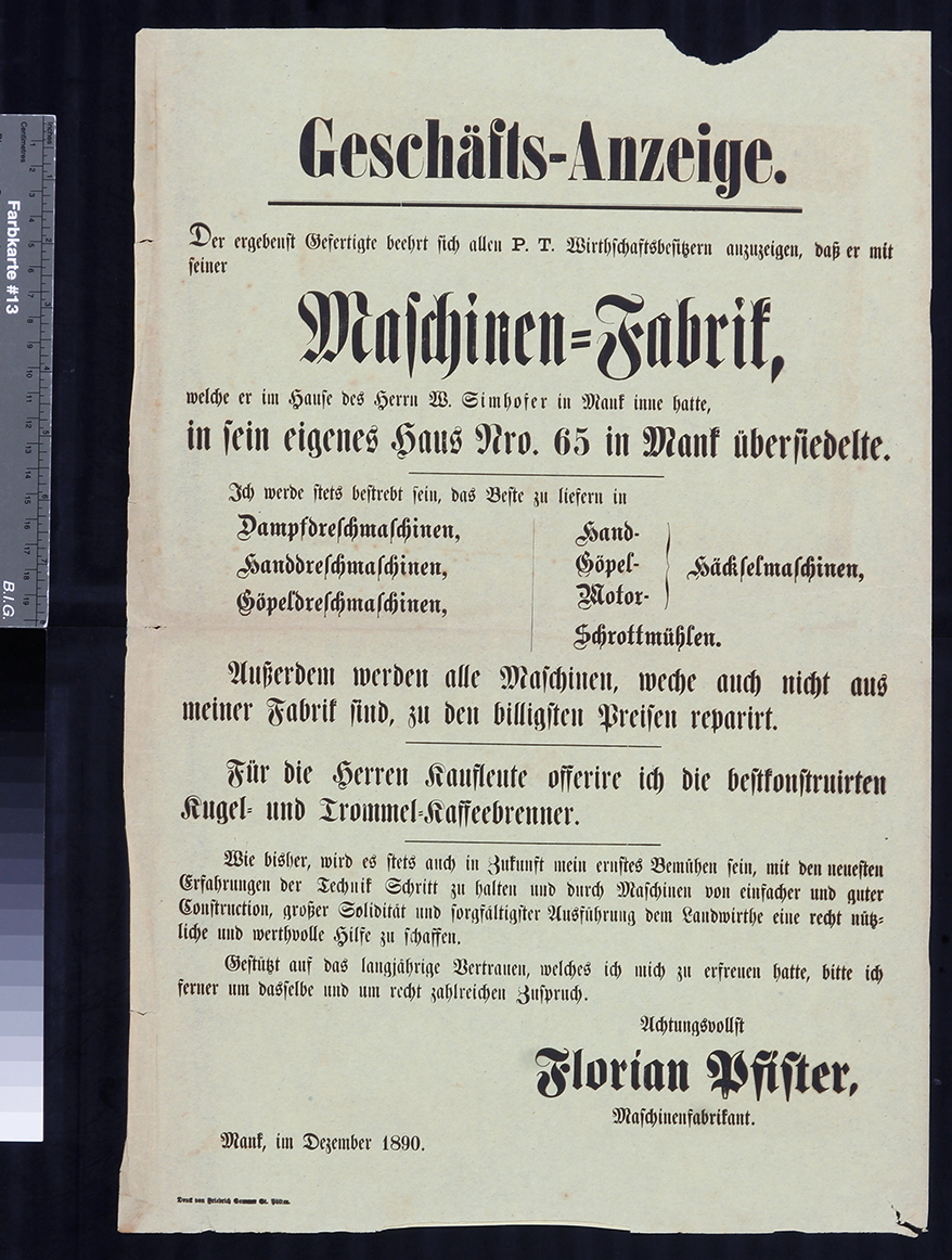 Geschäftsanzeige, Verlegung Maschinenfabrik Mank, Maschinenfabrikant Florian Pfister, Dezember 1890.