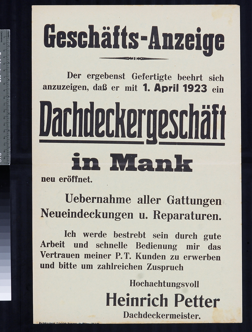 Geschäftsanzeige, Neueröffnung Dachdeckergeschäft Mank, Dachdeckermeister Heinrich Petter, 1. April 1923.