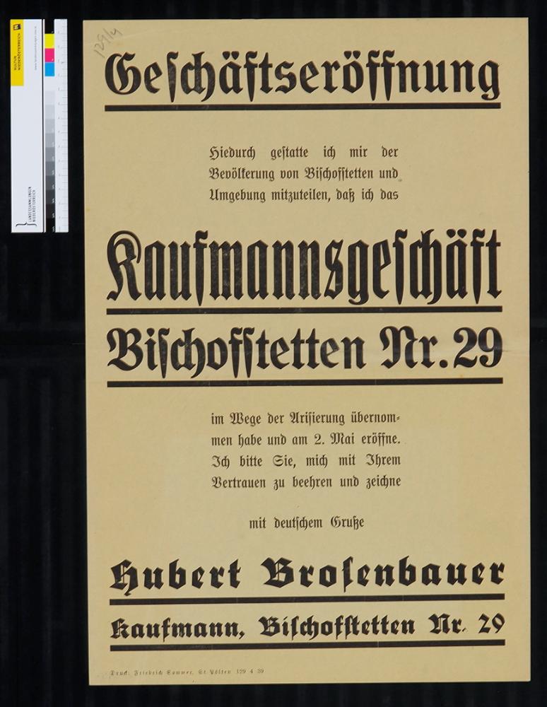 Bei der verkündeten Geschäftseröffnung handelt es sich um das durch die "" der Famiilie Fantl-Brumlik geraubte Kaufmannsgeschäft. Der neue Besitzer war das NSDAP-Mitglied Hubert Brosenbauer. In diesem Kontext ist auch die Floskel "mit deutschem Gruße" am Ende des Plakates zu verstehen.