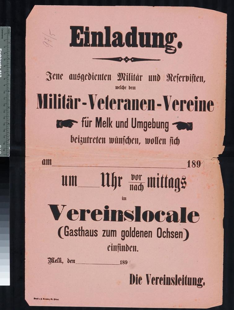 Einladung, Militärveteranenvereine für Melk und Umgebung, Vereinslokal und Gasthaus "zum goldenen Ochsen", 1891.