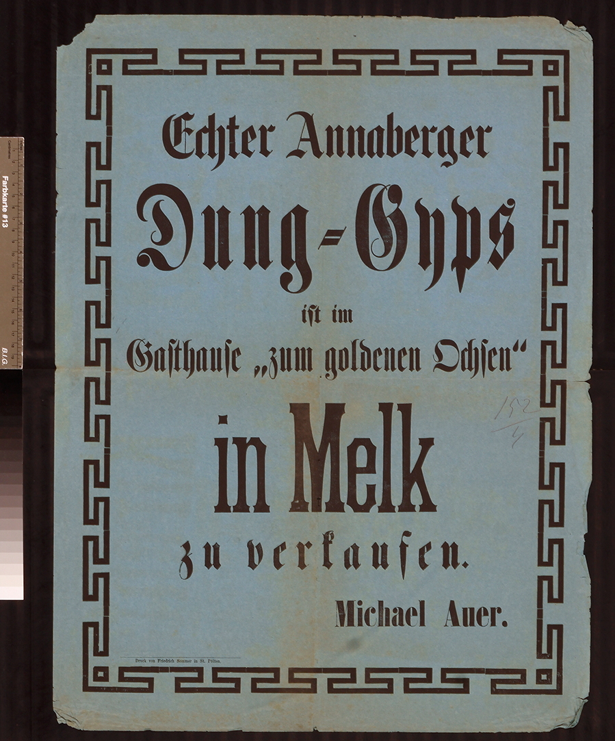 Kundmachung, Echter Annaberger Dung-Gyps Melk, Gasthaus "zum goldenen Ochsen", Michael Auer, 1883.