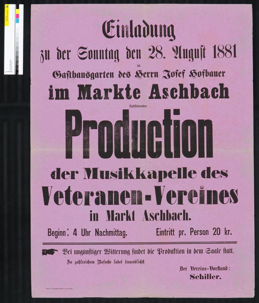 Einladung, Produktion der Musikkapelle des Veteranenvereines Markt Aschbach, Josef Hofbauer, 28. August 1881.